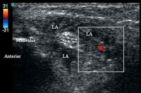 local anesthetic spread surrounding the posterior tibial nerve. N,