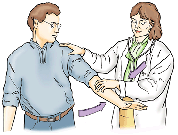 the elbow is flexed 90°, and the arm and forearm are placed on the