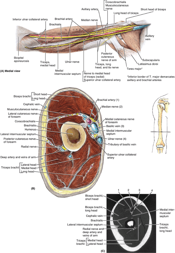 The glenohumeral and acromioclavicular joints are shown. The “white” (signal-intense) parts of the identified bones are the fatty matrix of cancellous bone; the thin black outlines (absence of signal) of the bones are the compact bone that forms their outer surfaces. A, acromion; C, clavicle; G, glenoid cavity; Gr, greater tubercle of humerus; H, head of humerus; N, surgical neck of humerus. B. The elbow region is shown. C. The proximal part of the forearm is shown. The orientation drawing shows the plane of the MRI. The subcutaneous border of the ulna (U) and the radial artery demarcate the anteromedial flexor and posterolateral extensor compartments. R, radius. D. In this image of the wrist and hand, the bones, joints, and interosseous muscles can be observed. (Courtesy of Dr. W. Kucharczyk, Professor and Chair of Medical Imaging, University of Toronto, and Clinical Director of Tri-Hospital Magnetic Resonance Centre, Toronto, Ontario, Canada.) |