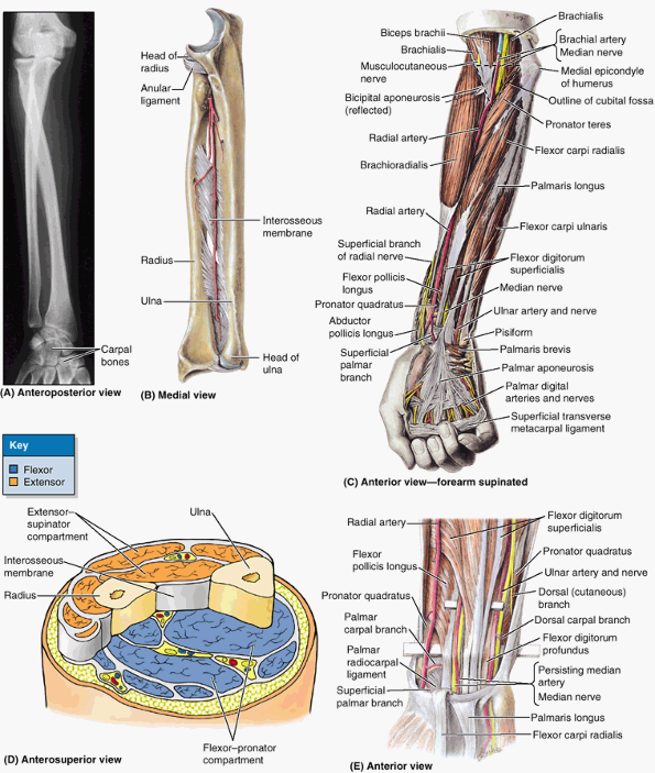 During pronation, the inferior end of the radius moves anteriorly and medially around the inferior end of the ulna, carrying the hand with it; thus in the pronated position, the radius crosses the ulna anteriorly. 1–5, the metacarpals. (Courtesy of Dr. J. Heslin, Toronto, Ontario, Canada.) |
