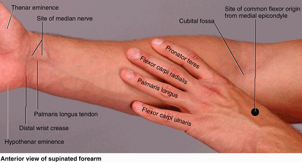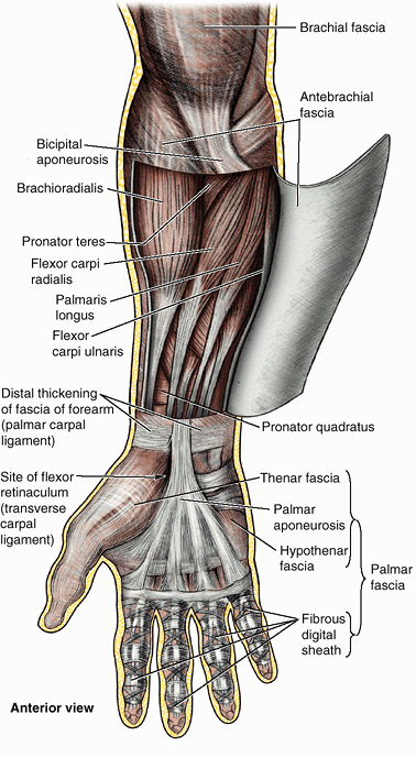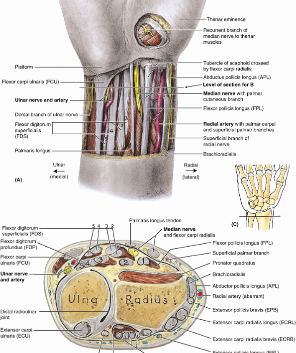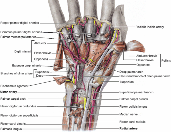 The superficial palmar arch, formed primarily by the ulnar artery, is usually completed by the superficial palmar branch of the radial artery. In this teenage hand, the carpal bones are fully ossified, but the epiphyseal lines of the long bones (e.g., radius and ulna) are still open. Closure occurs when growth is complete, usually at the end of the teenage years. (Courtesy of Dr. D. Armstrong, University of Toronto, Toronto, Ontario, Canada) |
