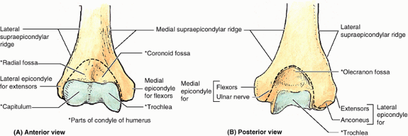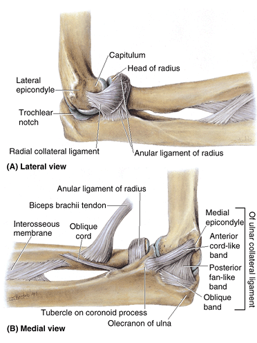 Figure 6.76. Radiographs of elbow joint. A. The joint planes (occupied by radiolucent articular cartilage) are especially evident in the extended joint. B.