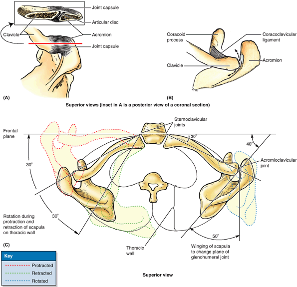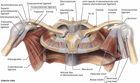pectoral girdle. The pectoral (shoulder) girdle is a bony ring, incomplete posteriorly, formed by the scapulae and clavicles and completed anteriorly by the manubrium of the sternum (part of the axial skeleton). -