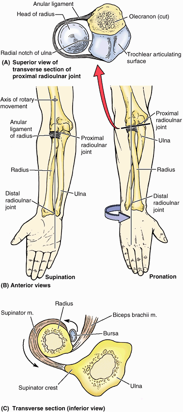 In Figure 6.77B, the way in which the radius crosses the ulna during forearm pronation is demonstrated.