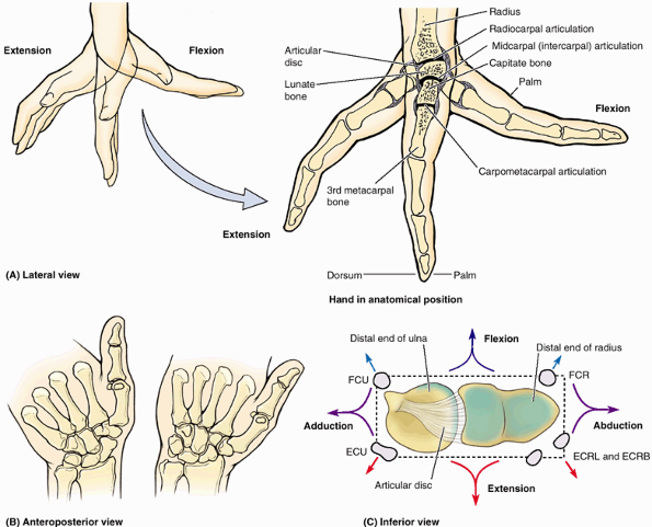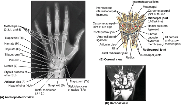 This lateral view shows the adult hand. (Courtesy of Dr. E. L. Lansdown, Professor of Medical Imaging, University of Toronto, Toronto, Ontario, Canada.) B. The distal end of the forearm and the hand of a 2.5-year-old child are shown. Ossification centers of only four carpal bones are visible. Observe the distal radial epiphysis (R). C, capitate; H, hamate; L, lunate; Tq, triquetrum. C. The inferior end of the forearm and hand of an 11-year-old child are shown. Ossification centers of all carpal bones are visible. The arrow indicates the pisiform lying on the anterior surface of the triquetrum. The distal epiphysis of the ulna (U) has ossified but all epiphyseal plates (lines) “remain open” (i.e., they are still unossified). S, scaphoid; Td, trapezoid; Tz, trapezium. (Courtesy of Dr. D. Armstrong, Associate Professor of Medical Imaging, University of Toronto, Toronto, Ontario, Canada.) |