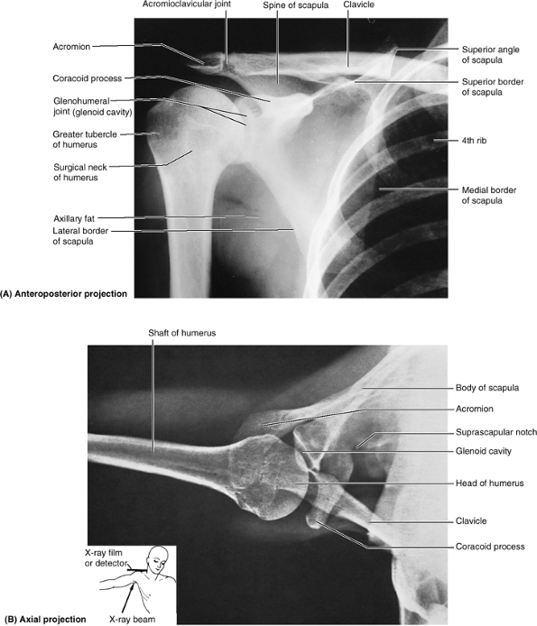 The head of the humerus and the glenoid cavity overlap, obscuring the joint plane because the scapula does not lie in the coronal plane (therefore the glenoid cavity is oblique, not in a sagittal plane, which is especially evident in part B). (Courtesy of Dr. E. L. Lansdown, Professor of Medical Imaging, University of Toronto, Toronto, Ontario, Canada) B. The orientation drawing shows how the axial projection radiograph was taken. |